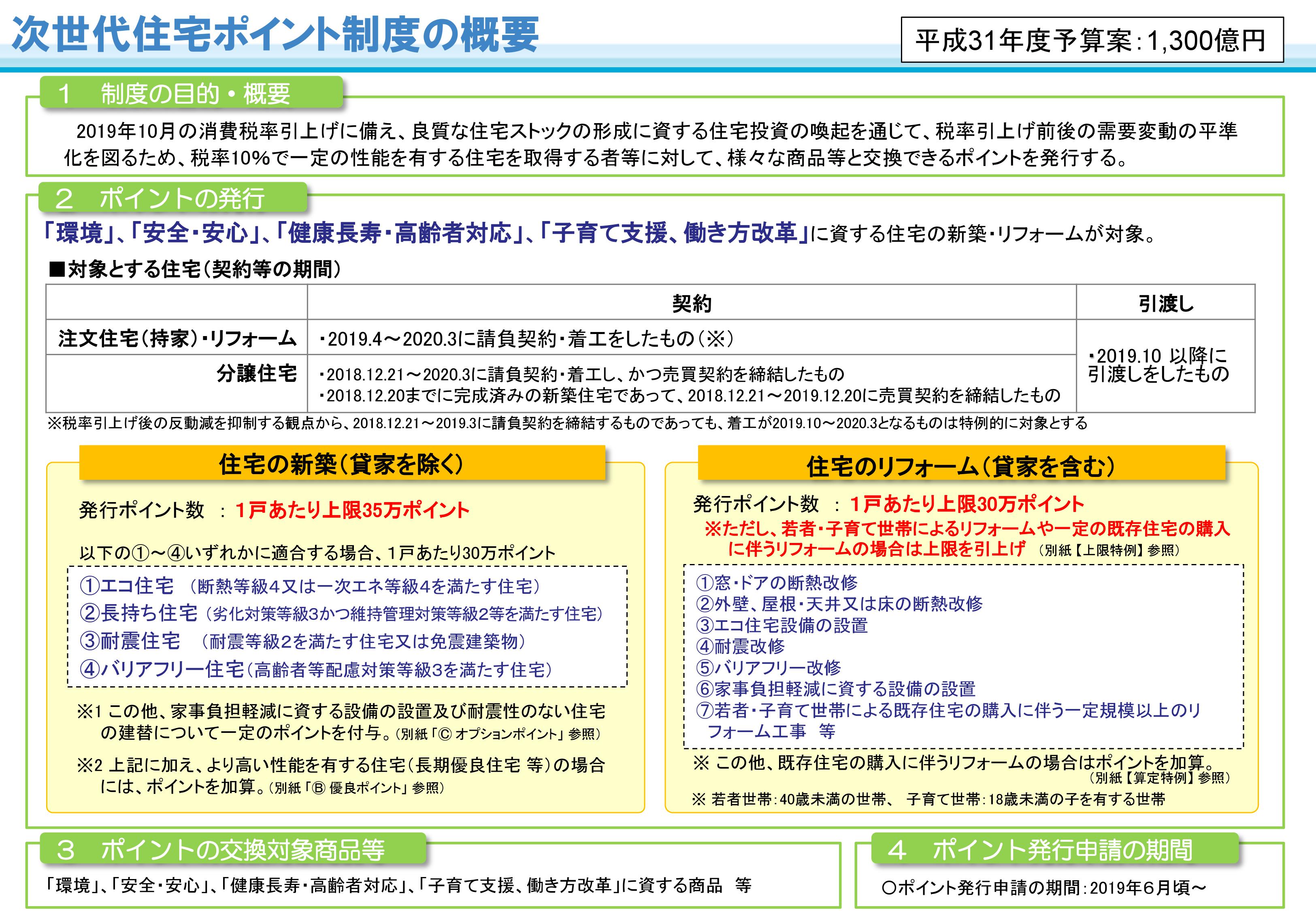 先日記事にしました、消費増税に対する支援策の1つ「次世代住宅ポイント」制度。詳しくは下の画像を見ていただきたいのですが、住宅の新築については次の4項目の住宅が当てはまります。