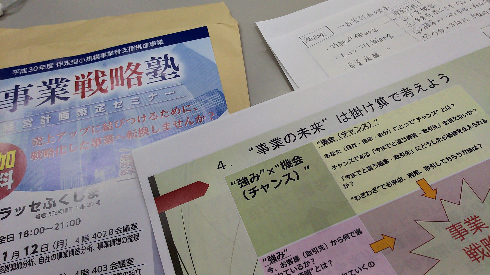 昨日記事にした「まちなか活性化リーダー養成講座」を終え、1時間のインターバルを挟んで挑んだのが「事業戦略塾」。地元・桑折町商工会が主催する経営計画策定セミナーで、全3回のラストをこの日に迎えることになりました。