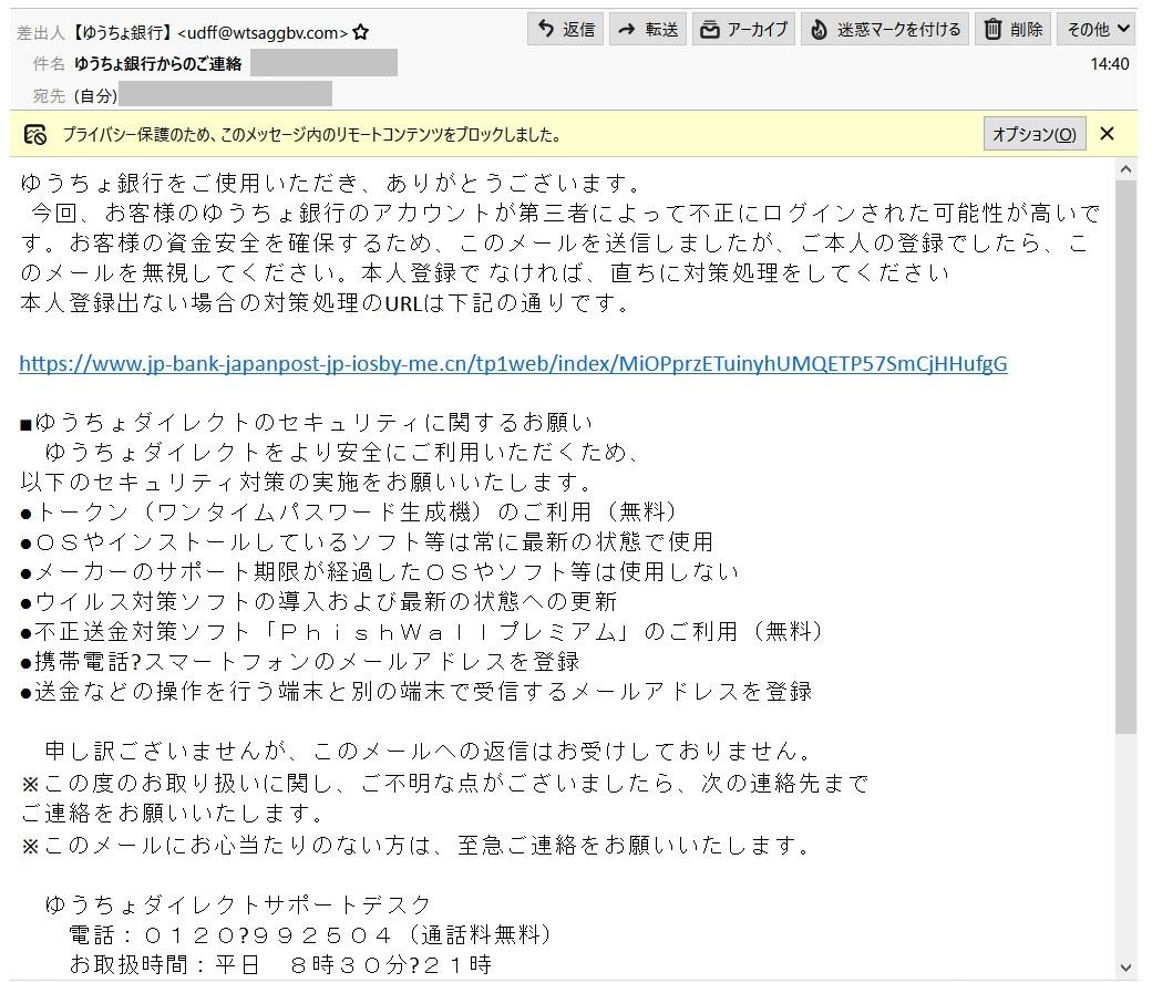 【注意】「ゆうちょ銀行からのご連絡 (M90***********)」という、ゆうちょ銀行をかたる迷惑メールが届きました。